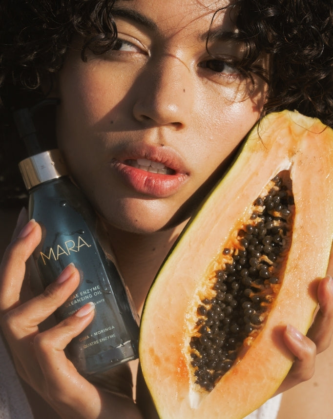 Simmondsia Chinensis (Jojoba) Seed Oil, Caprylic/Capric Triglyceride, Helianthus Annuus (Sunflower) Seed Oil, Moringa Oleifera Seed Oil, Squalane, Polyglyceryl-3 Laurate, Polyglyceryl-2 Caprate, Silica, Aloe Barbadensis Extract, Carica Papaya (Papaya) Fruit Extract, Chamomilla Recutita (Matricaria) Flower Extract, Chrondus Crispus Extract, Citrus Grandis (Grapefruit) Fruit Extract, Lactobacillus/Pumpkin Ferment Extract, Laminaria Digitata Extract, Spirulina Maxima Extract, Citrus Aurantium Bergamia (Bergamot) Fruit Oil, Salvia Hispanica Seed Oil, Bromelain, Tocopheryl Acetate, Maltodextrin, Leuconostoc/Radish Root Ferment Filtrate, Limonene.